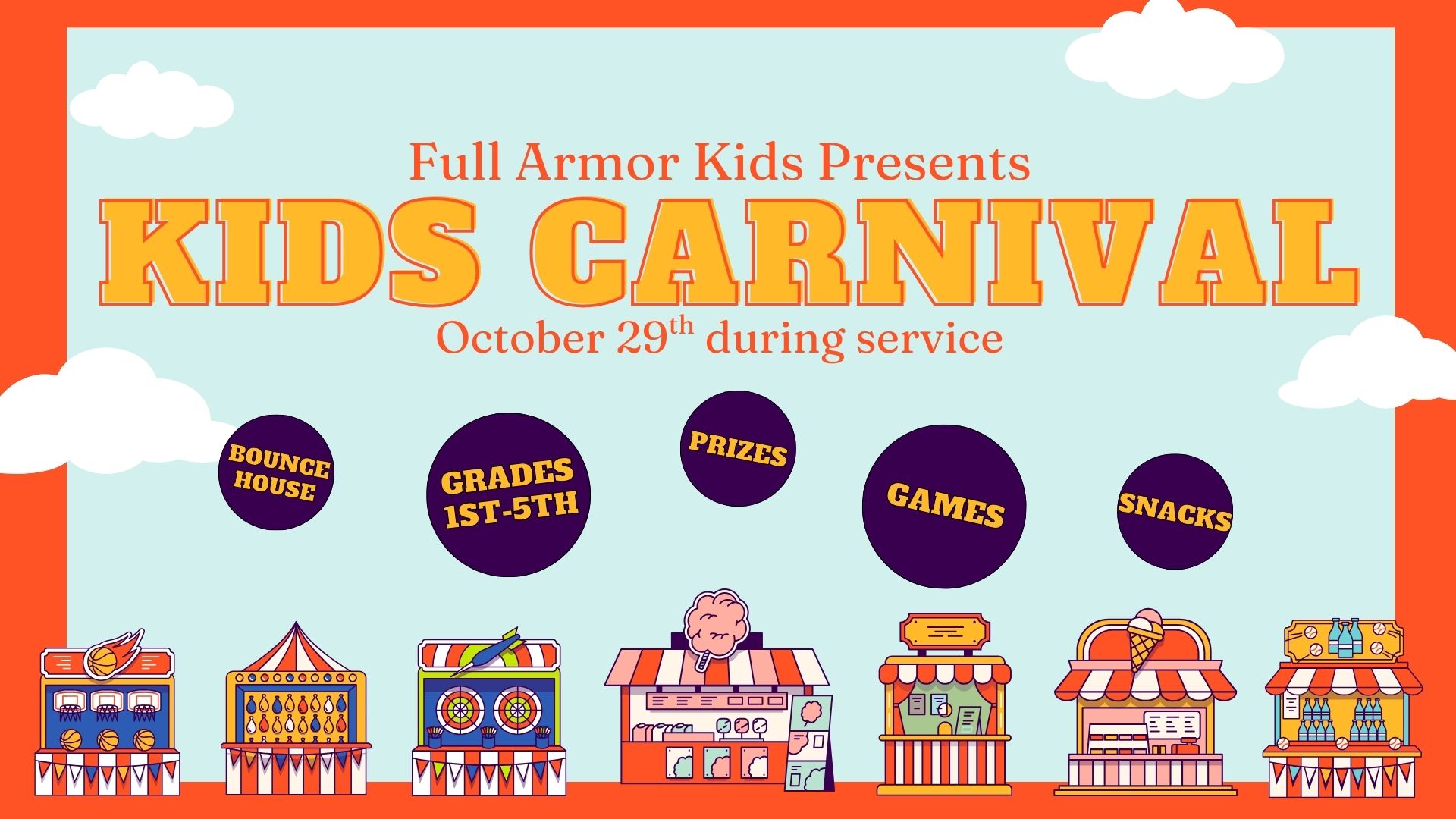 Kids Carnival is back and we are excited to take the opportunity to serve our kids and kids of the community in a faith and fun filled night! On Wednesday night, October 29th from 7-8:30pm, Full Armor Kids will be hosting a kids’ carnival for 1st-5th graders. The evening will be filled with worship, prayer, and lots of fun and games! Kids are welcomed to dress in costumes if they like, but do not have to dress up to participate. If a child does wear a costume, we ask that it isn’t evil, scary, or bloody. We want to honor and glorify our Lord Jesus with everything we do and see. We are looking forward to this event and so are the kids! Candy donation and small, wholesome toys accepted at kids church counter leading up to the event.