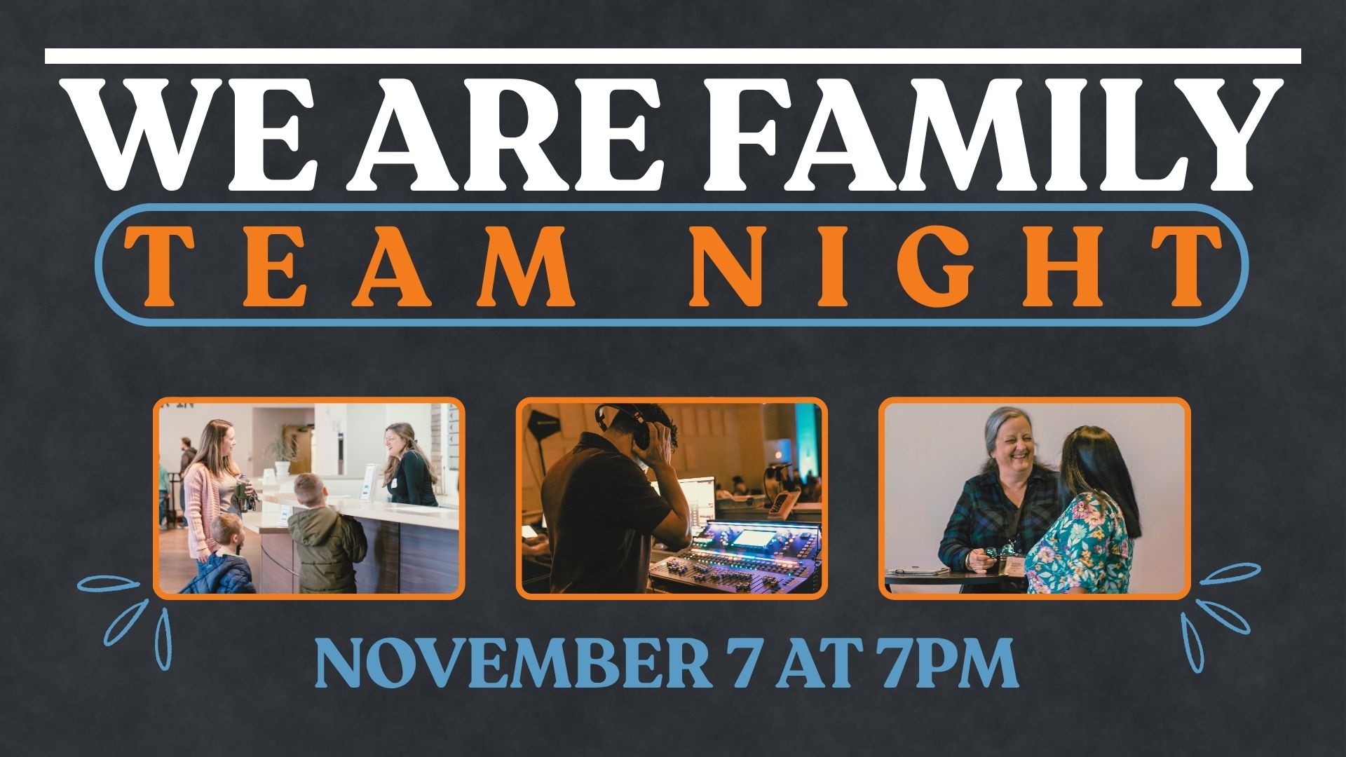 Are you a part of our serving family? Join us for TEAM NIGHT! This is a time where we come together to honor YOU and pour vision! We hope to see you there on November 7th at 7pm. Dinner is provided.